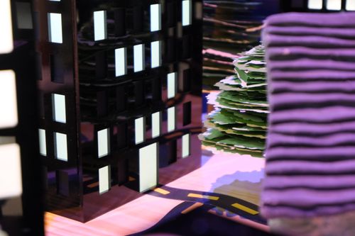 Memories are stored in our wellspring, always ready to be drawn and remembered. Much like a tree’s dendrochronology, my innocent youth begins in the center, traverses through the labyrinth of adolescence, and transitions to my adulthood.Growing up in Sacramento allowed me to be carefree and creative, marked by my ceramic house. Forced to move around into many different houses and towns, the forest represents my adolescent self, wandering around to find a place to settle. Once I had finally settled in a suburban city near San Francisco, I headed off to San José State University, in a bustling urban downtown city, as a young adult.As much as this piece is a physical representation of my life, it signifies my emotional turmoil through medium. My formative years were highly artistic and creative. However, my adolescence was filled with doubt and anxiety. Now in the city, I feel a sense of isolation and monotony. Using technology, we can visit the past and view our memories, returning to our younger selves.